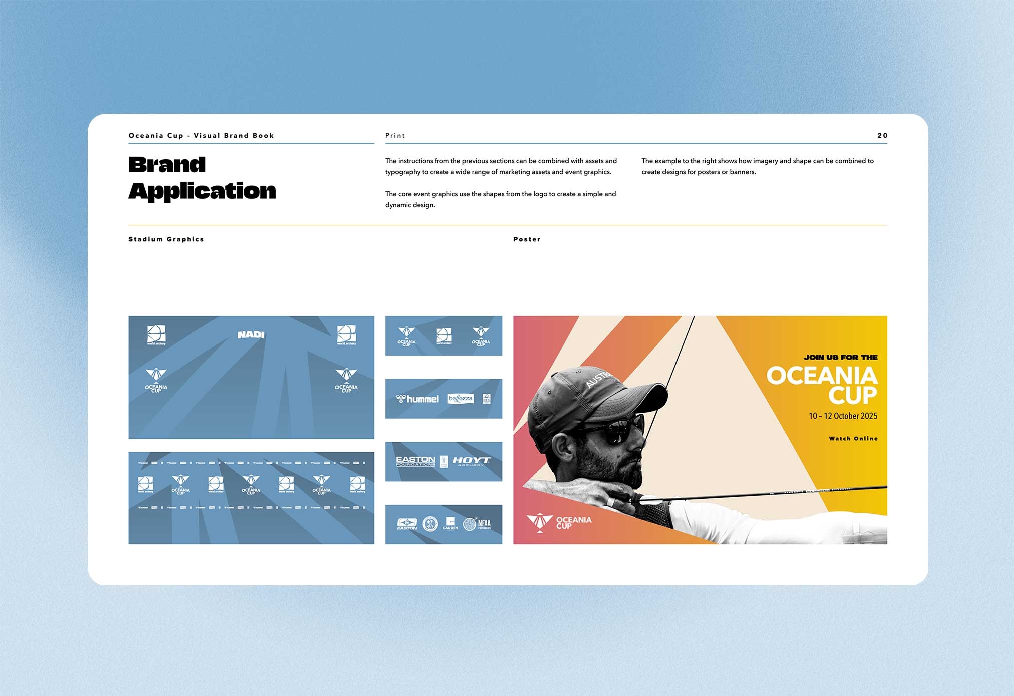 Steve Dawson was tasked with creating a random package for a sports event. The branding needed to represent the Oceanic area which was achieved by utilising common colours and shapes found across the area and combined into a cup shape for the logo.